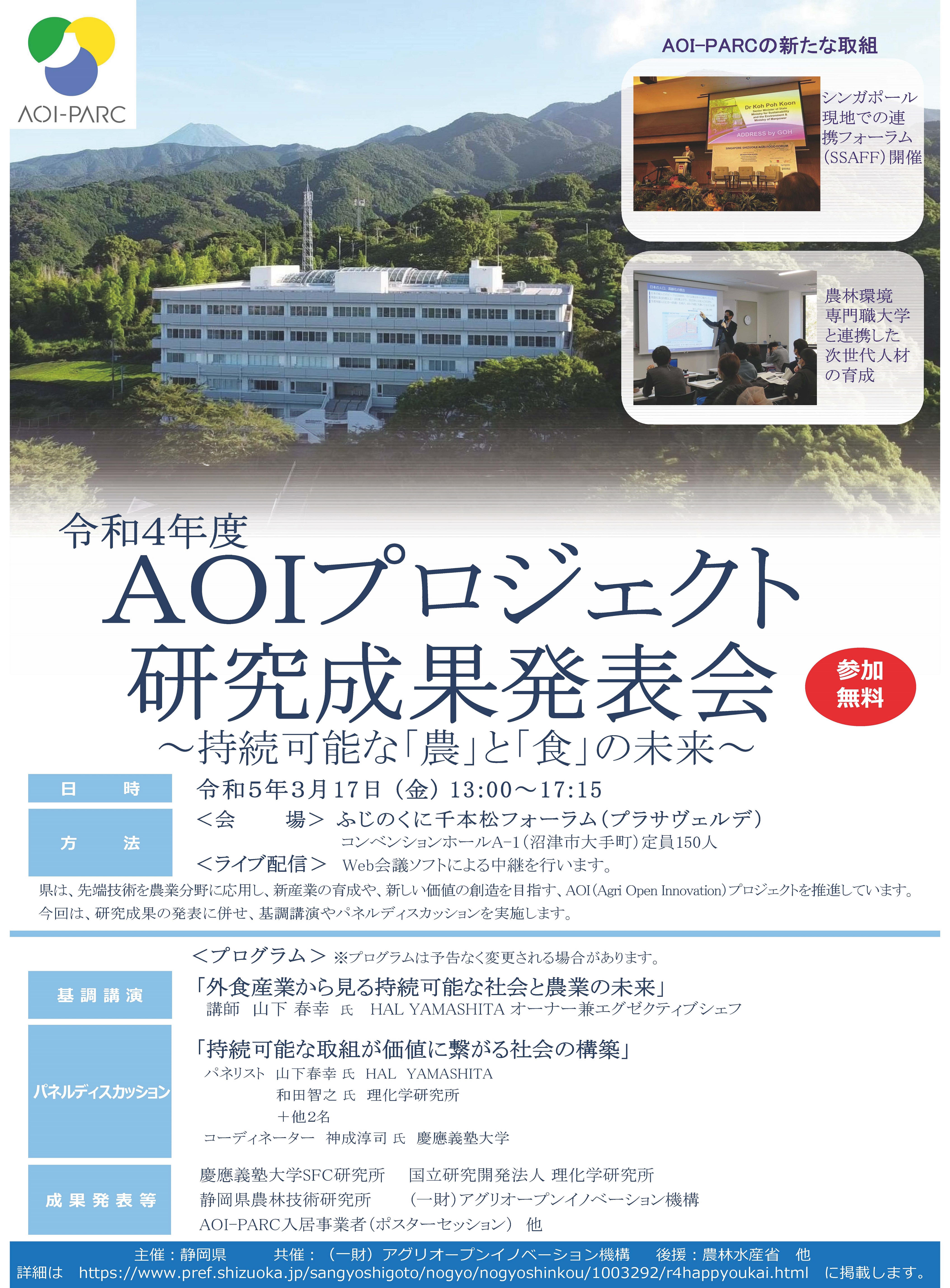 静岡県と一般財団法人アグリオープンイノベーション機構は、民間事業者との連携による研究・開発を加速化させるため、AOIプロジェクトの拠点であるAOI-PARCの各機関の取組内容や研究成果を紹介する「令和4年度AOIプロジェクト研究成果発表会」を開催します。