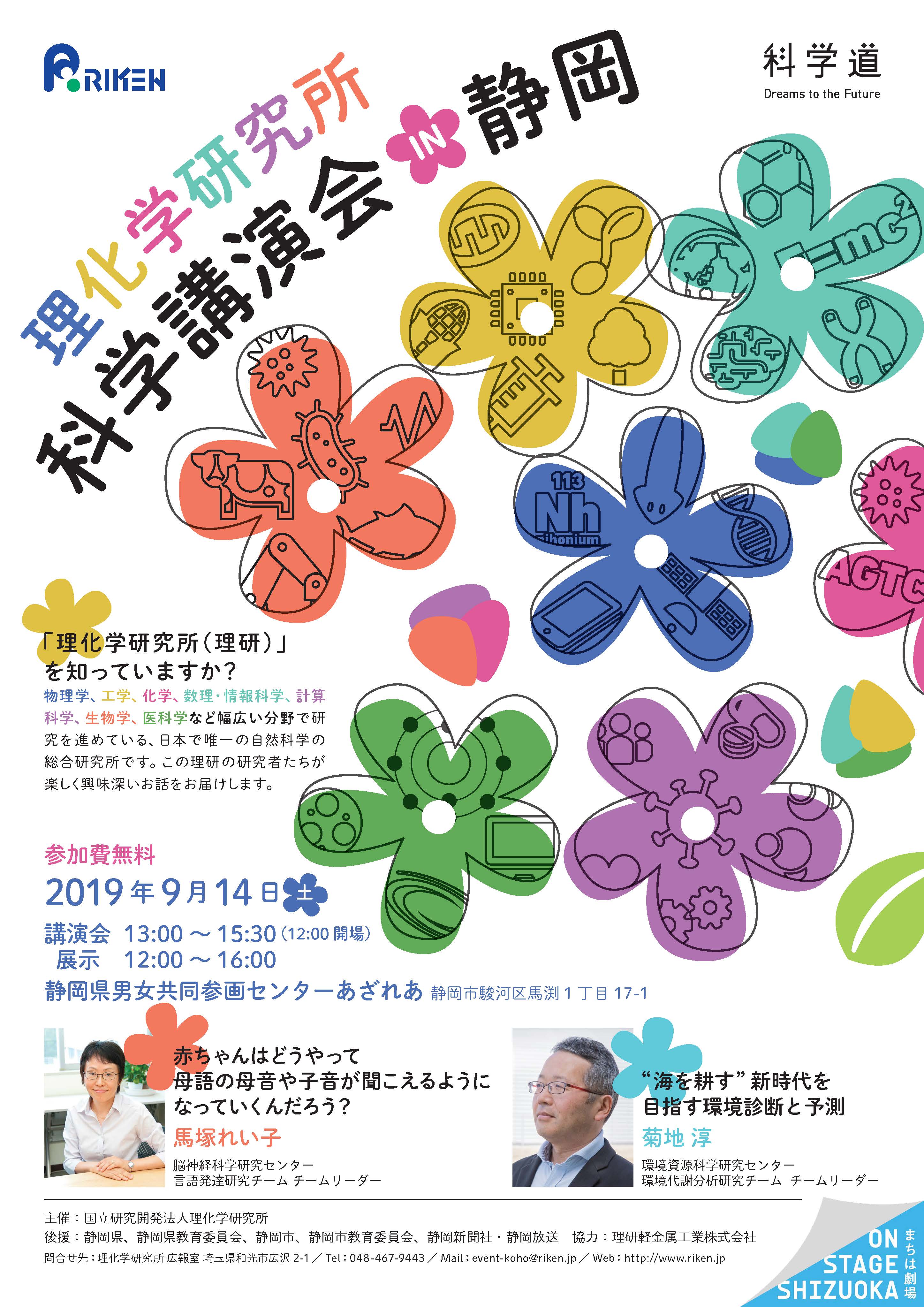 | 会場 | 静岡県男女共同参画センターあざれあ (静岡県静岡市駿河区馬渕1丁目17-1) 講演会:6/7階 大ホール 展示等:6階 小ホール「理研展」、 6階エレベーターホール「科学道100冊」、「科学道100冊ジュニア」展 |
