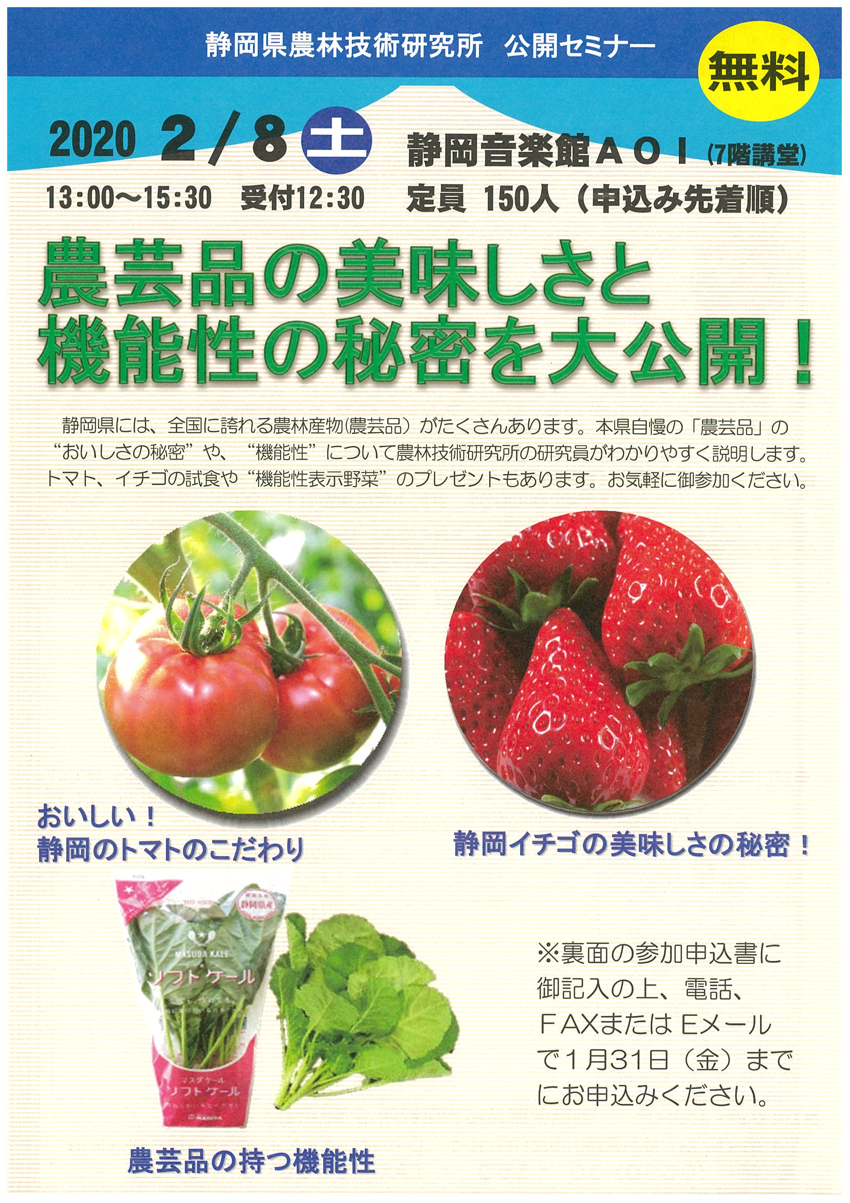 | 講演者 | ①おいしい!静岡のトマトのこだわり (野菜生産技術科 主任研究員 田島万穂路氏) ②静岡イチゴの美味しさの秘密 (野菜生産技術科 研究員 松田孝平氏) ③農芸品の持つ機能性 (次世代栽培システム科 研究員 柳瀬恵氏) |