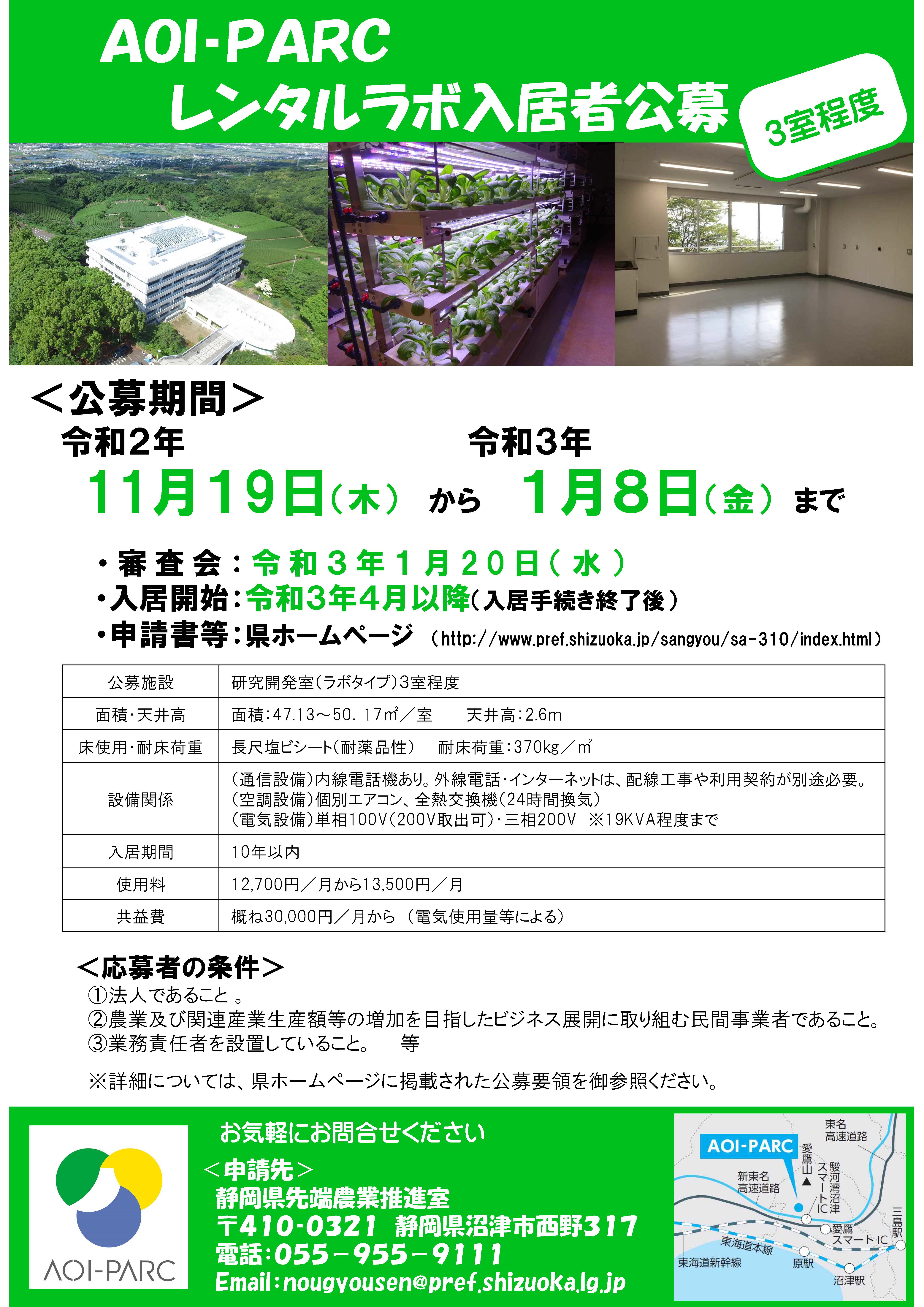 私どもAOI機構も入居しておりますAOI-PARCで、貸し研究室(ラボタイプ 3室程度)の入居者募集の公募が始まりました。是非入居を御検討ください。