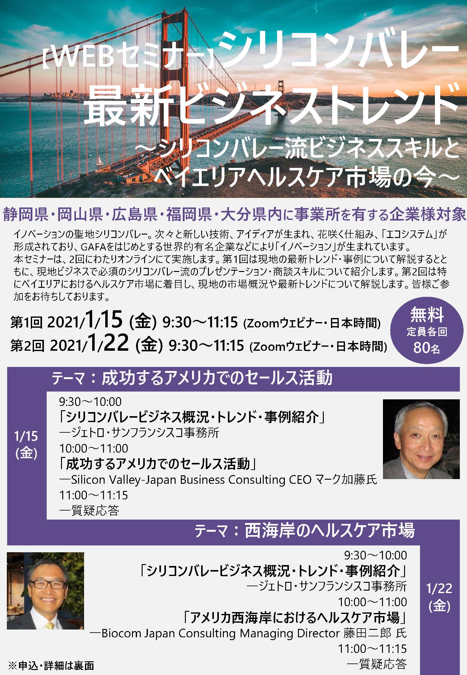 静岡県が加盟している米日カウンシルガバナーズ・サークル実行委員会(静岡県,長野県,岡山県,広島県,福岡県,大分県)と、ジェトロ広島では、「シリコンバレー最新ビジネストレンド」WEBセミナーを2回にわたり開催いたします。