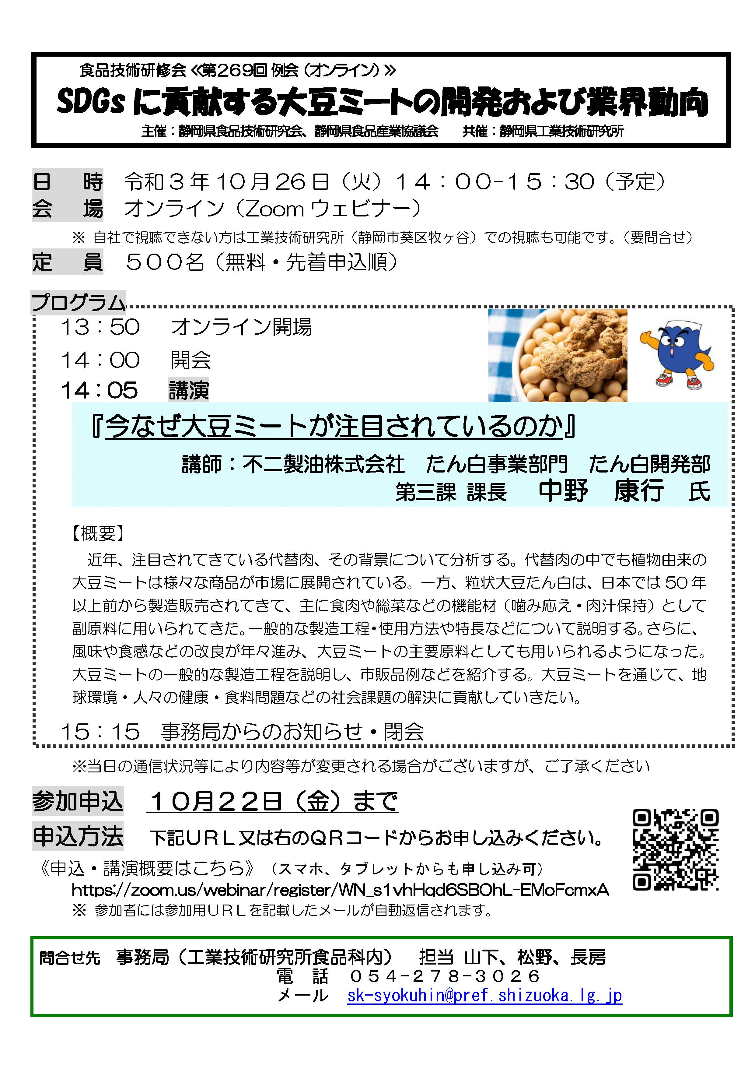 | プログラム | 13:50~ 開場 14:00~ 開会(会長挨拶) 14:05~ 講演『今なぜ大豆ミートが注目されているのか』 講師:不二製油株式会社 たん白事業部門 たん白開発部第三課 課長 中野康行 |