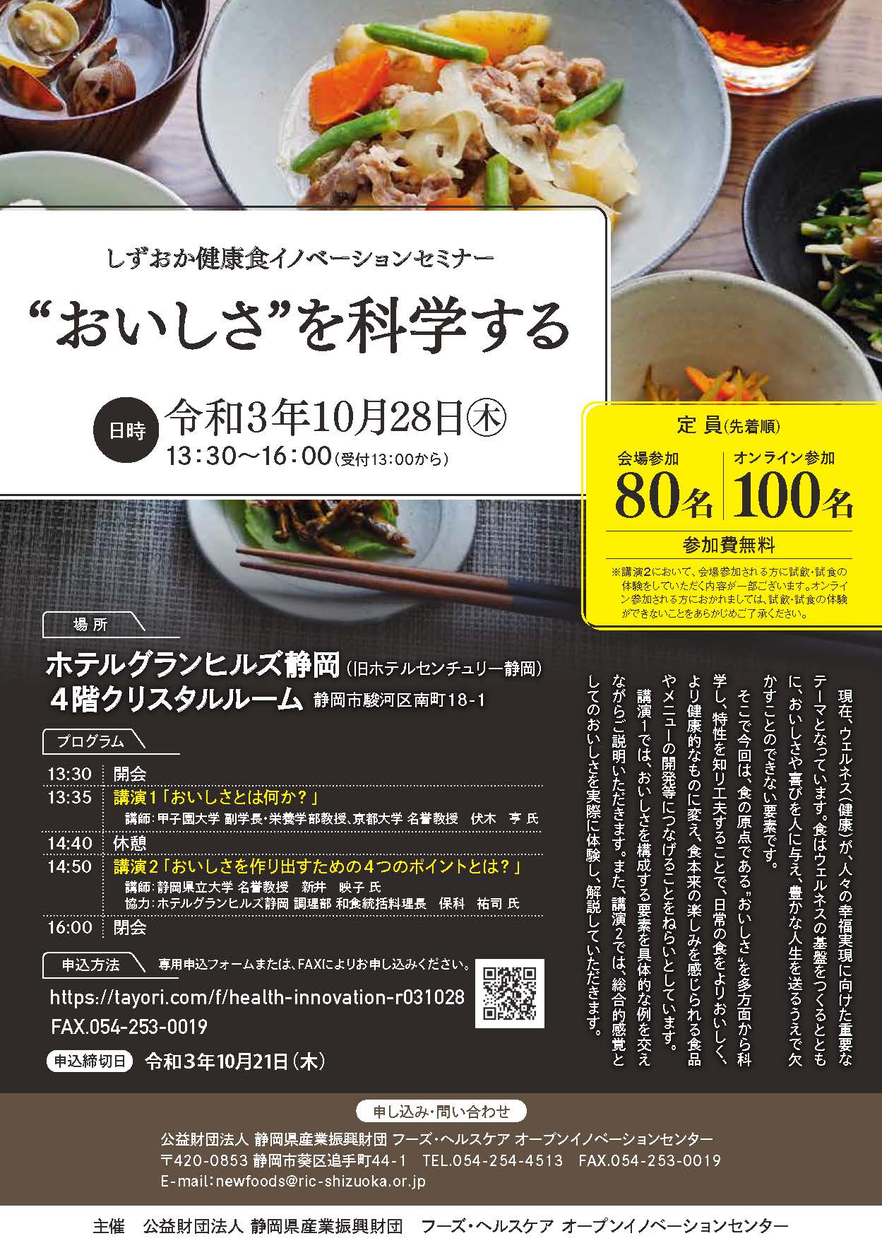 AOIフォーラムサポーター会員である公益財団法人静岡県産業振興財団フーズ・ヘルスケアオープンイノベーションセンターが、ホテルグランヒルズ静岡にて、食の原点である“おいしさ”を多方面から科学し、特性を知り工夫することで、日常の食をよりおいしく、より健康的なものに変え、食本来の楽しみを感じられる食品やメニューの開発等につなげること目的に「しずおか健康食イノベーションセミナー “おいしさ”を科学する」を開催します。