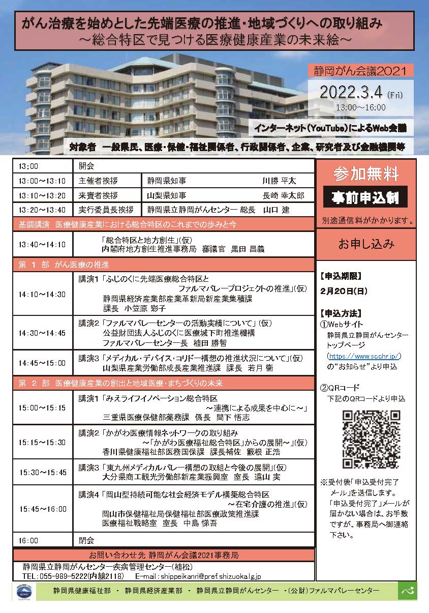 | 主催 | 静岡県立静岡がんセンター・静岡県健康福祉部・静岡県経済産業部・公益財団法人ふじのくに医療城下町推進機構ファルマバレーセンター |