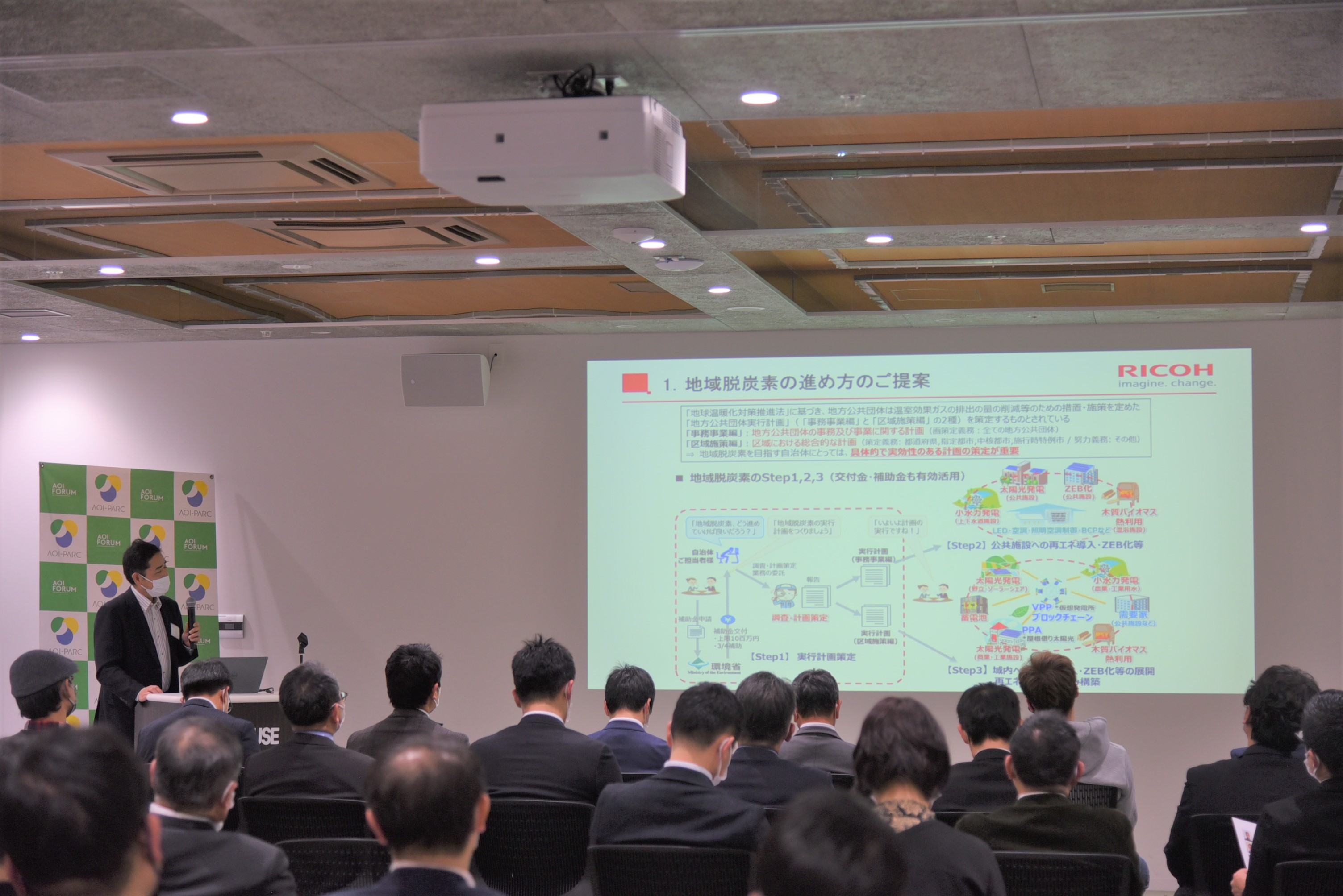 「株式会社リコー」は地域の脱炭素化に向けて自治体やコンサル会社と一緒に活動しています。農業分野ではAOIフォーラム会員のスマートブルー株式会社と連携して、コミュニティファームを提案しています。コミュニティファームとはソーラーシェアリングをコア技術にした地域の脱炭素化と農業活性化の同時実現を目指す提案です。