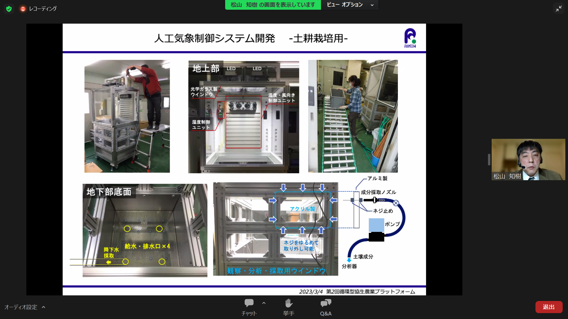 次に、理化学研究所 光量子制御技術開発チーム・専任研究員の松山知樹氏より、「人工環境下の土耕耕培 ダイズの場合」と題した報告がありました。