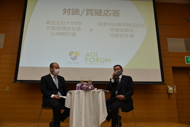 対談では、山崎代表取締役社長から沼津中央青果の集荷拠点の機能について質問したり、丹藤常務取締役が販路拡大のノウハウを披露したりしました。