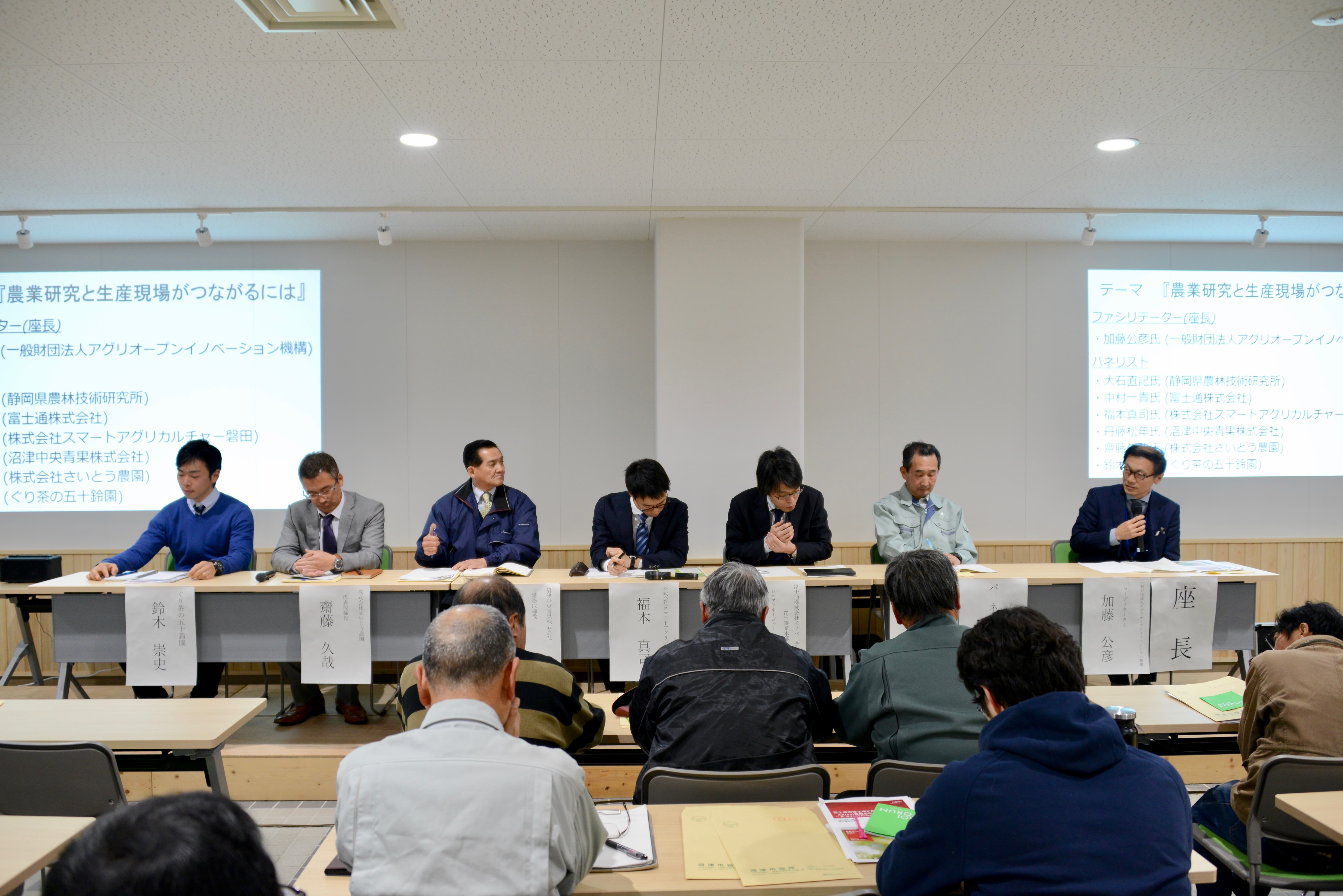 後半は「農業研究と生産現場がつながるには」をテーマに、パネルディスカッションが行われました。ファシリテーターは、AOI機構コーディネーターの加藤公彦氏。パネリストには、静岡県農林技術研究所研究統括監 兼 次世代栽培システム科長の大石直記氏、富士通株式会社イノベーティブIoT事業本部Akisai事業部シニアマネージャーの中村一貴氏、先の講演で登壇した福本真司氏、沼津中央青果株式会社常務取締役の丹藤松年氏に加え、農業従事者代表には、高糖度トマトブランドの「アメーラ」を栽培する株式会社さいとう農園代表取締役の齋藤久哉氏、ぐり茶の五十鈴園の鈴木崇史氏、6名が登壇しました。