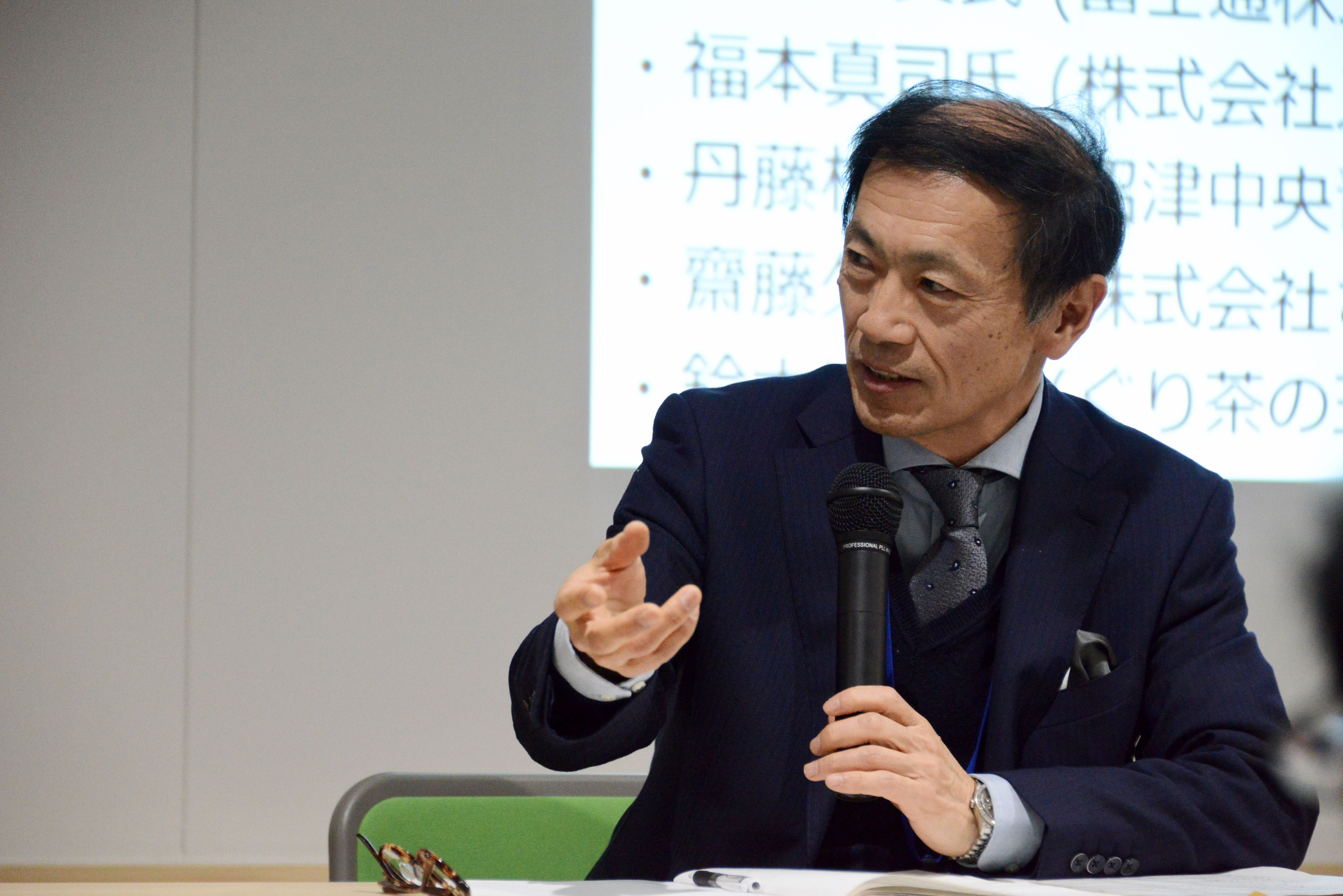 鈴木氏からは、先の講演を受けて「静岡県内には、ICTを活用した最先端の農業施設があるにも関わらず、知らない人が多い。また、ICTの導入に際しては、コスト面が把握しにくく不安がある」と、取り組みの全体像が見えにくい点が指摘されました。また「茶園の防霜対策のために、各農家が毎朝4時に起きて気象状況を確認する方法は極めて原始的である。予知情報をデータ共有し、スマホからの操作で現場の対策が可能になると良い」との提案がされました。この意見を受け、中村氏からは「センサーを圃場に立てモニタリングすることで、遠隔操作・自動制御することは技術的に可能である。しかしコスト面の問題から、段階的に取り組む必要がある」との意見が述べられました。