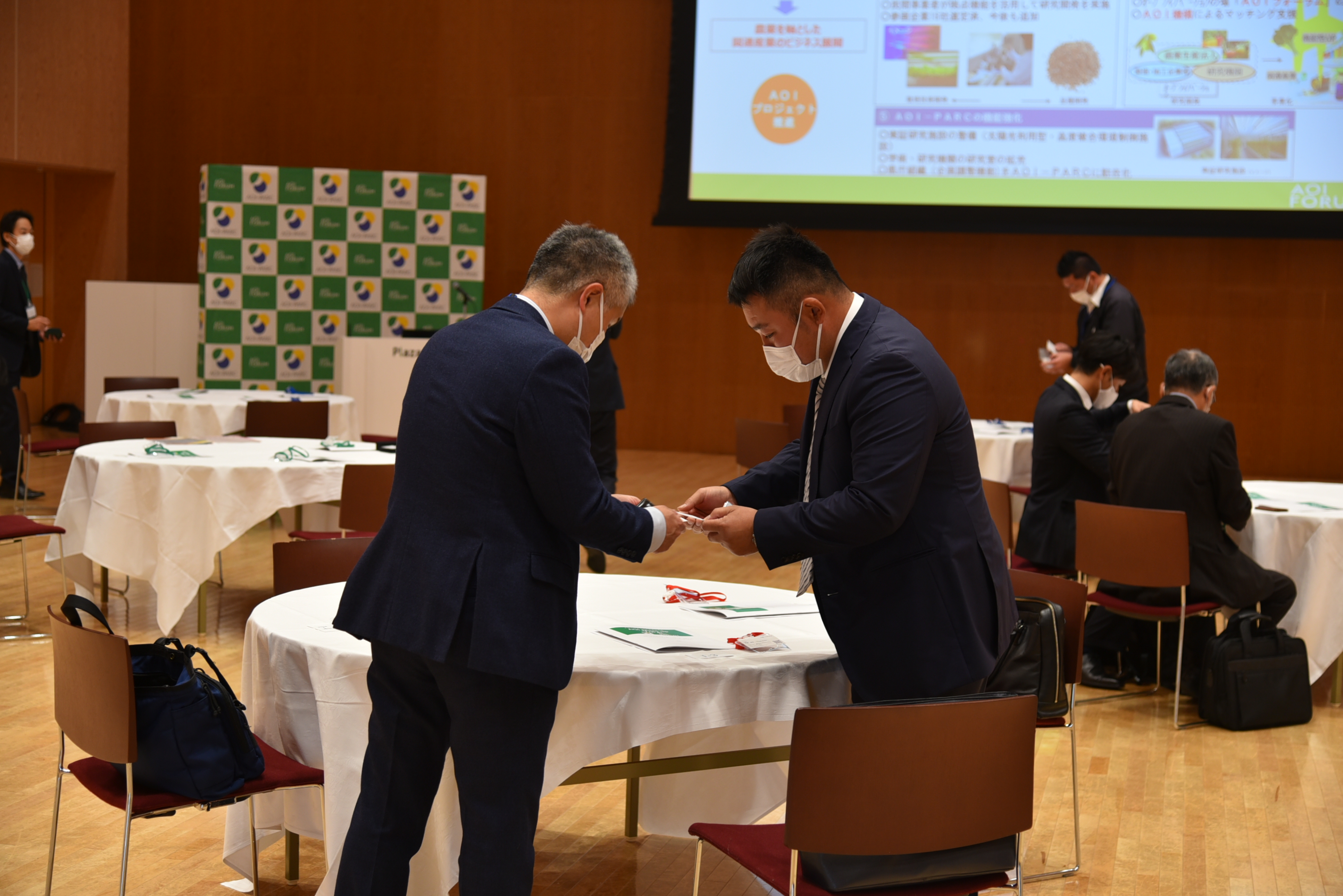 ショートプレゼンテーション終了後は、会員間の交流、商談を目的としたマッチングの時間となりました。発表内容で気になった企業にダイレクトにアプローチできる場とあって、参加者は思い思いに席を立ち、お目当ての企業に声を掛けていきます。今回は交流を活発にするための仕掛けとして、各テーブルにAOI機構のコーディネーターを配置。それぞれの会員の紹介や引き合わせを行っていました。