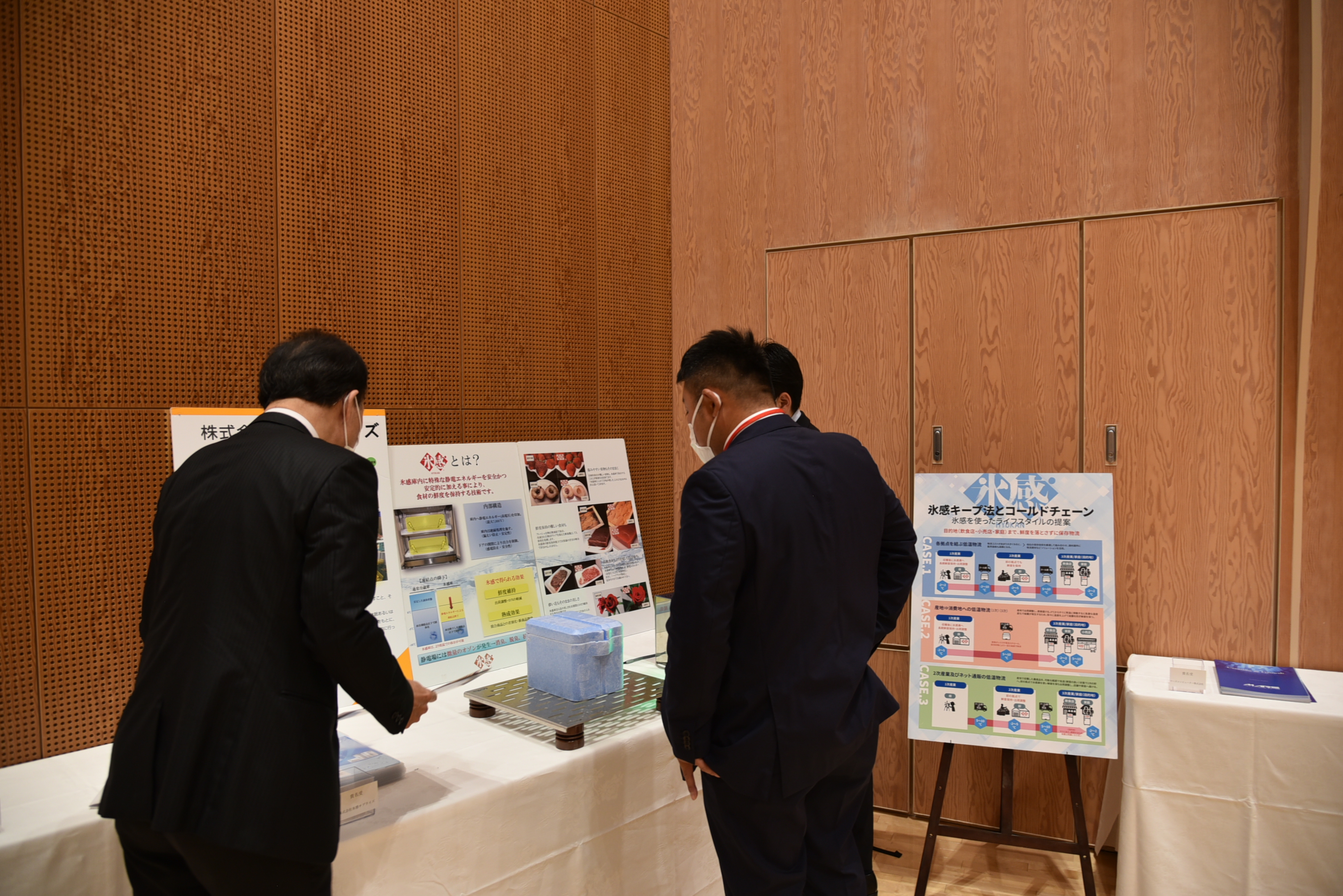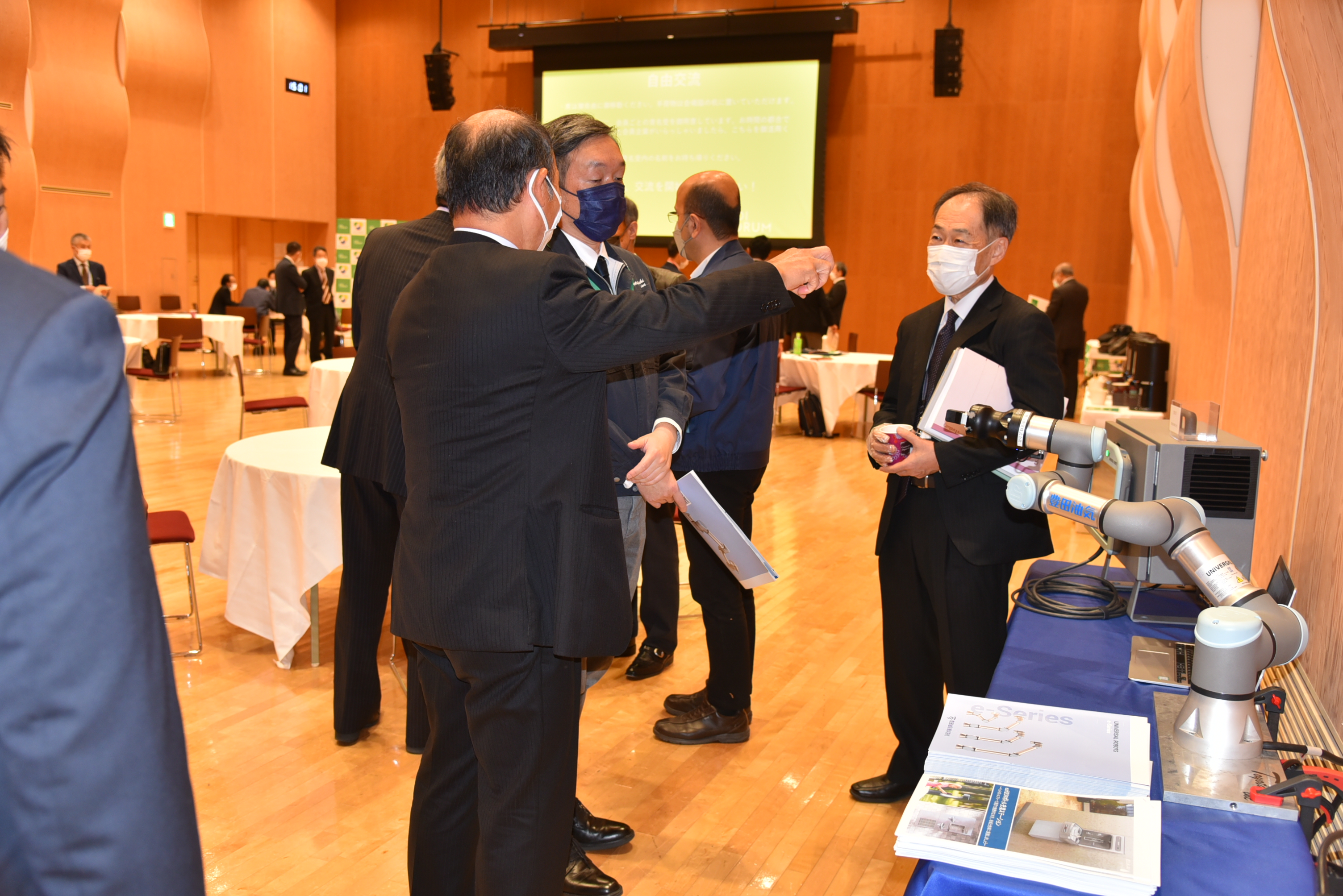 会場には、各社のパンフレットや関連資料、素材のサンプルやロボットなどが並びました。参加者は、実際にサンプルを手に取ったり、ロボットを興味深く見たりしていました。特に、氷点下でも凍らない冷凍庫を提供する「株式会社氷感サプライズ」や、アーム型ロボットを持ち込んだ「豊田油気株式会社」のブースには、実機が展示されたこともあり、名刺交換をする人の列ができました。