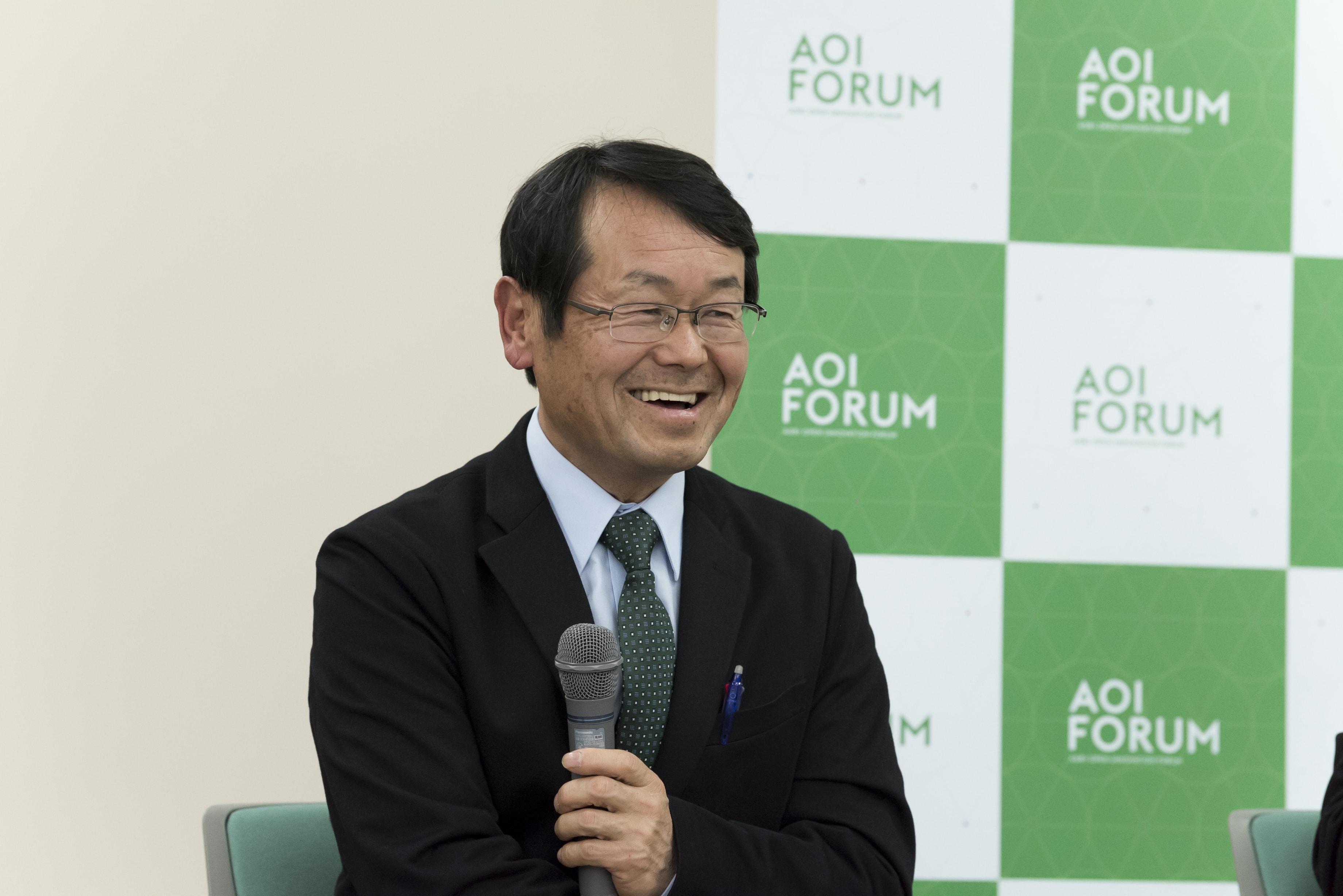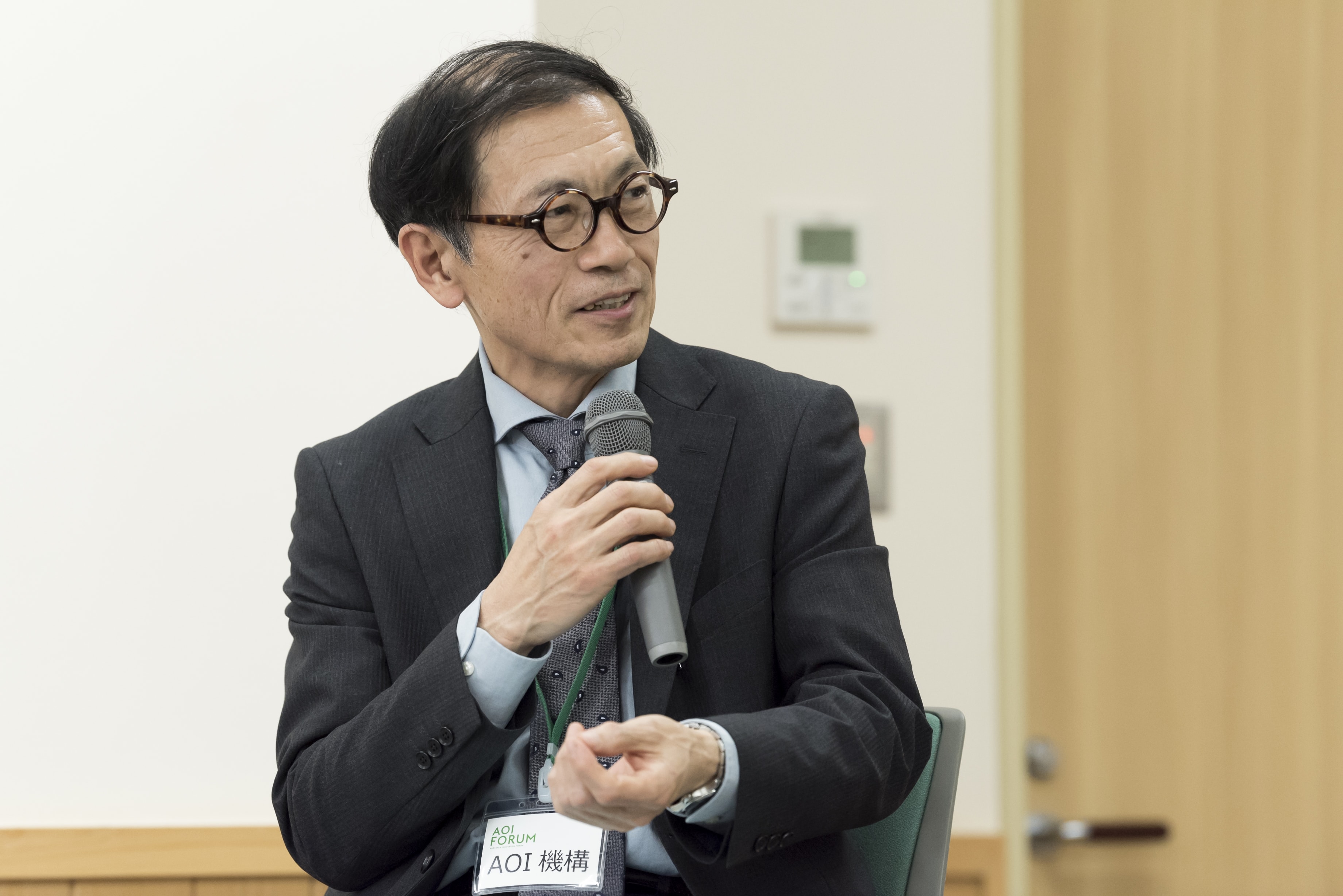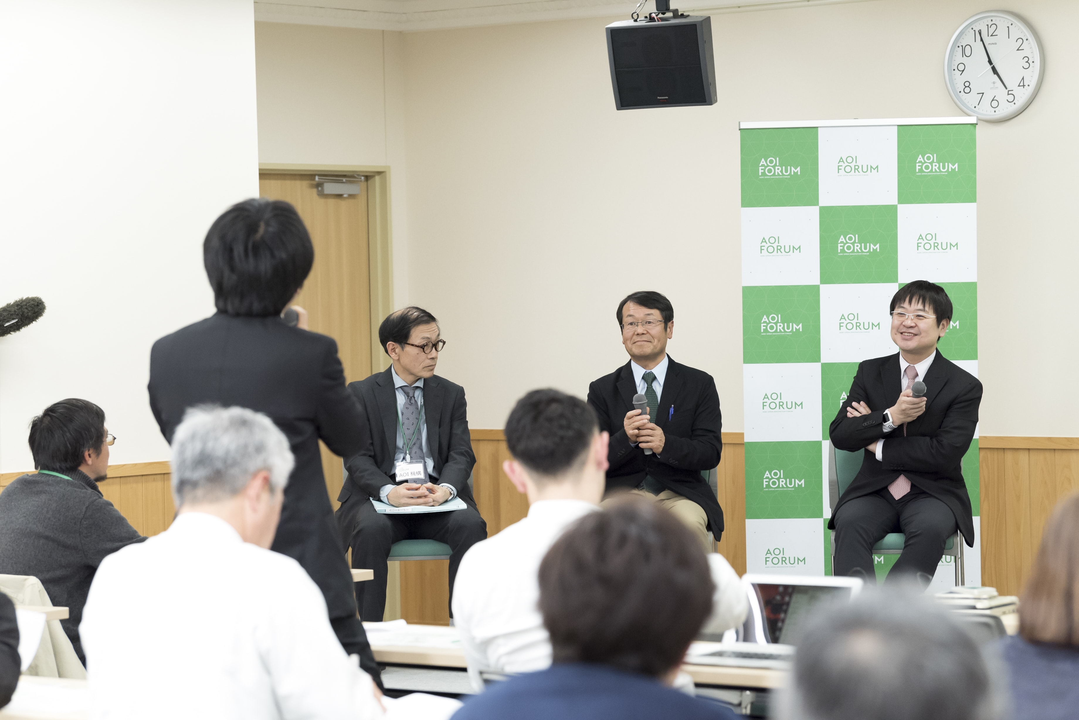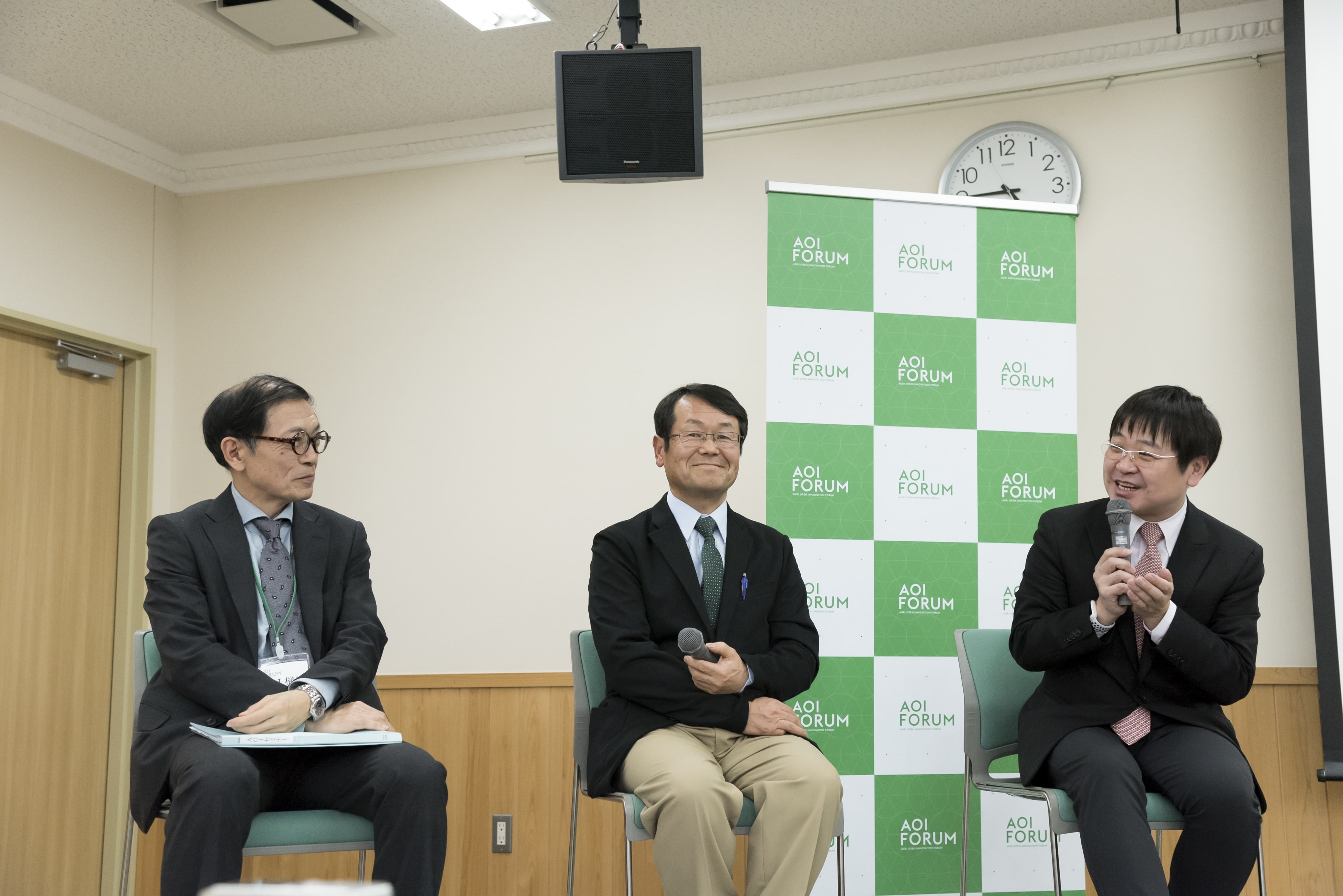 パネルディスカッションでは、司会に神成氏、登壇者に末澤氏とAOI機構コーディネーターの加藤氏を迎え、AOIフォーラムの拠点である静岡県と、末澤氏の活動拠点でもある香川県との地域連携について、議論が交わされました。