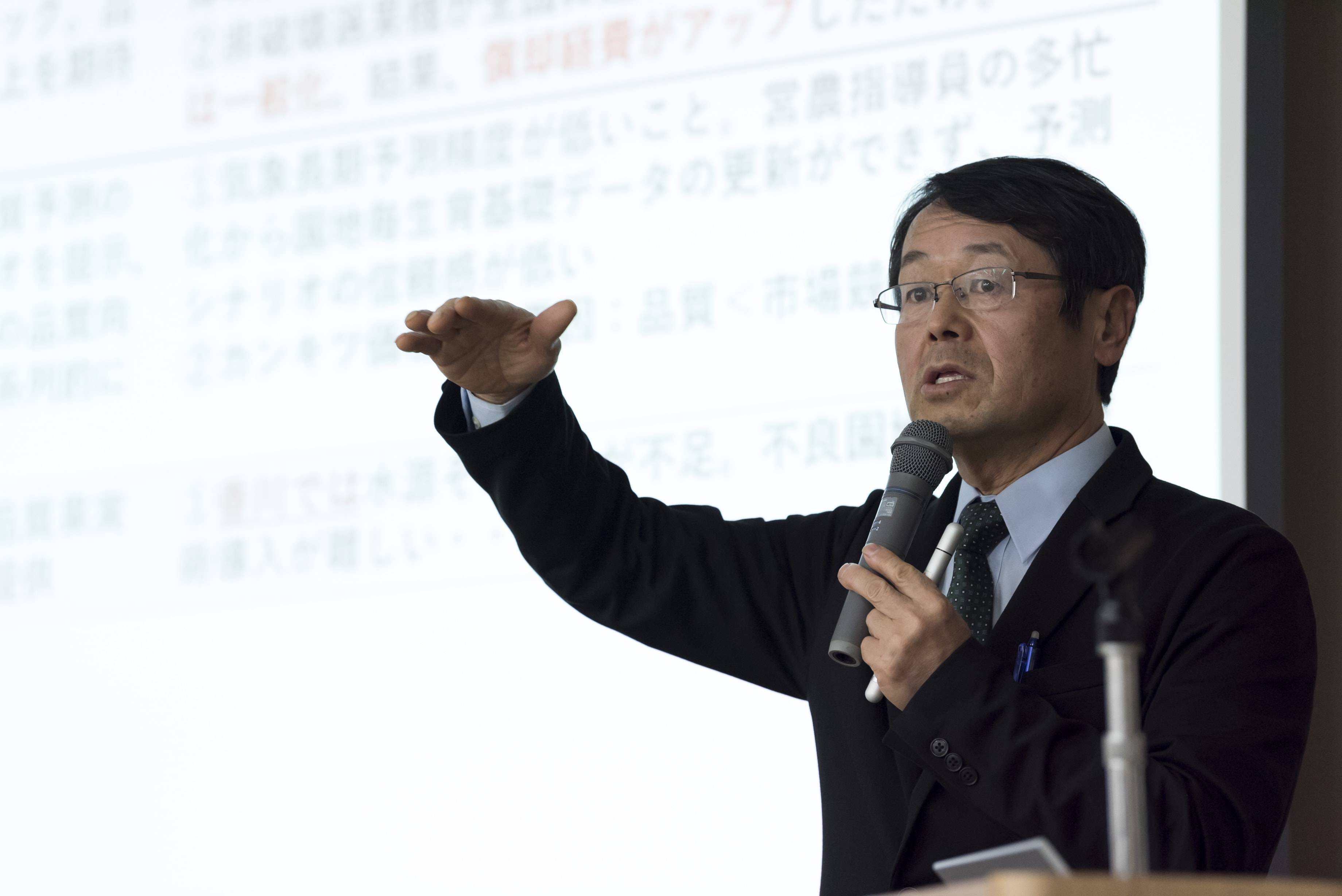 次に「農業ICT技術の現場定着にかかる課題と今後」と題して、香川県農業試験場府中果樹研究所 前所長で、現 オーチャードアンドテクノロジー代表取締役の末澤氏にご登壇いただきました。