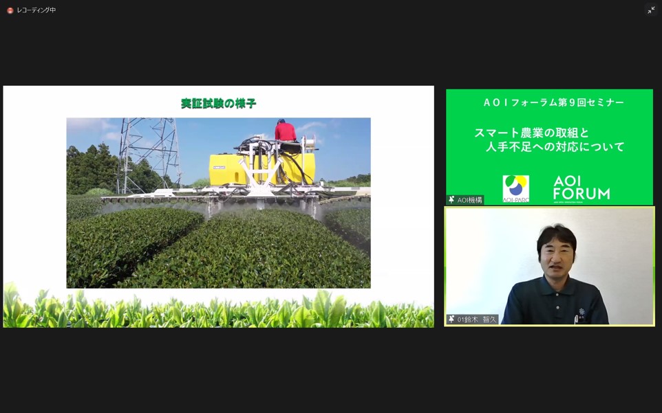 山田氏によると、この事業はロボット、AI、IoTなどの先端技術を実装したスマート農業を加速させるもので、期間は2年間。導入による経営効果を明らかにしたそうです。今回は、2019年度に開始した同プロジェクトで、茶を対象とした事業に参画したカワサキ機工株式会社とNECソリューションイノベータ株式会社がそれぞれの取組と成果を発表することになりました。